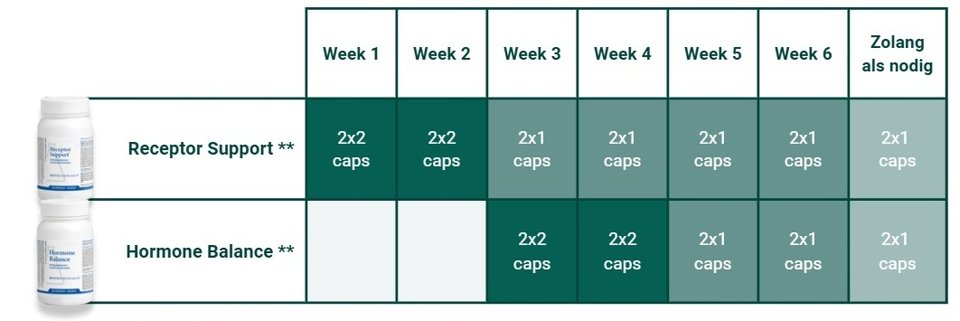 De kuur bestaat uit 2 verpakkingen Receptor Support en 2 verpakkingen Hormone Balance. Het geadviseerde innamemoment van de supplementen zijn tijdens het ontbijt en tijdens het diner. Indien je slaapproblemen ondervindt vanwege enkele licht-activerende ingrediënten, dan is het aan te raden om het 2e innamemoment te veranderen van diner naar lunch. De supplementen zijn niet geschikt voor kinderen onder de 12 jaar.