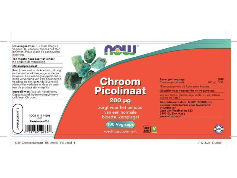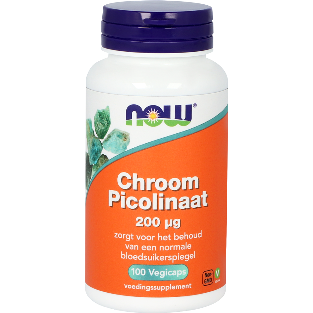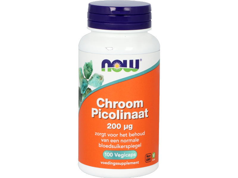 NOW Chroom Picolinaat bevat 200 mcg per capsule. Chroom helpt het bloedsuikergehalte normaal te houden en draagt bij aan een normale vertering van koolhydraten, vetten en eiwitten.