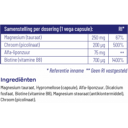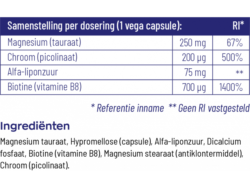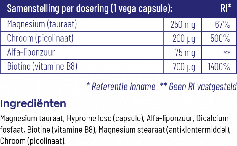 Overige ingrediënten: Magnesium tauraat, Hypromellose (capsule), Alfa-liponzuur, Dicalcium fosfaat, Biotine (vitamine B8), Magnesium stearaat (antiklontermiddel), Chroom (picolinaat).