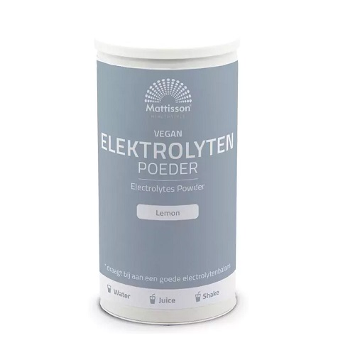 Mattisson Elektrolyten poeder met een lemon smaak. Dit poeder is geschikt om je elektrolyten aan te vullen na het sporten of bij langdurig of extreem zweten. Het elektrolytenpoeder van Mattisson bevat een breed scala aan elektrolyten (natrium, magnesium, fosfor, zink, kalium, calcium en chloride).