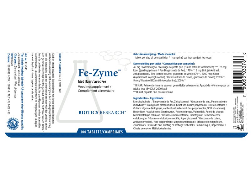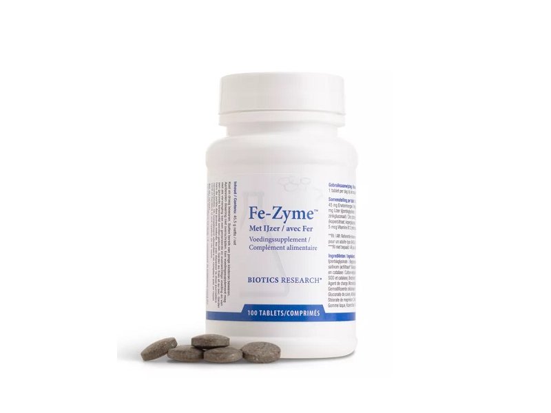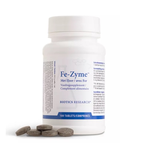 Biotics Fe-Zyme is een IJzer supplement met zink, koper en vitamine B12. Voor een ijzersupplement is de bisglycinaat vorm een uitstekende keuze. Het is de meest biologische vorm en dat zorgt voor een goede opname en beschikbaarheid.