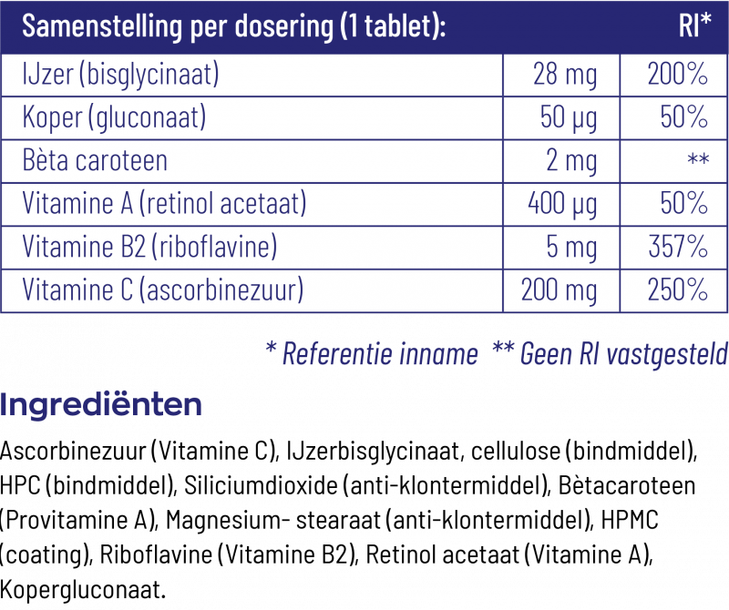 Overige ingrediënten: Ascorbinezuur (Vitamine C), IJzerbisglycinaat, cellulose (bindmiddel), HPC (bindmiddel), Siliciumdioxide (anti-klontermiddel), Bètacaroteen (Provitamine A), Magnesium-stearaat (anti-klontermiddel, HPMC (coating), Riboflavine (Vitamine B2), Silicium dioxide (anti-klontermiddel), Retinol acetaat (Vitamine A), Kopergluconaat.