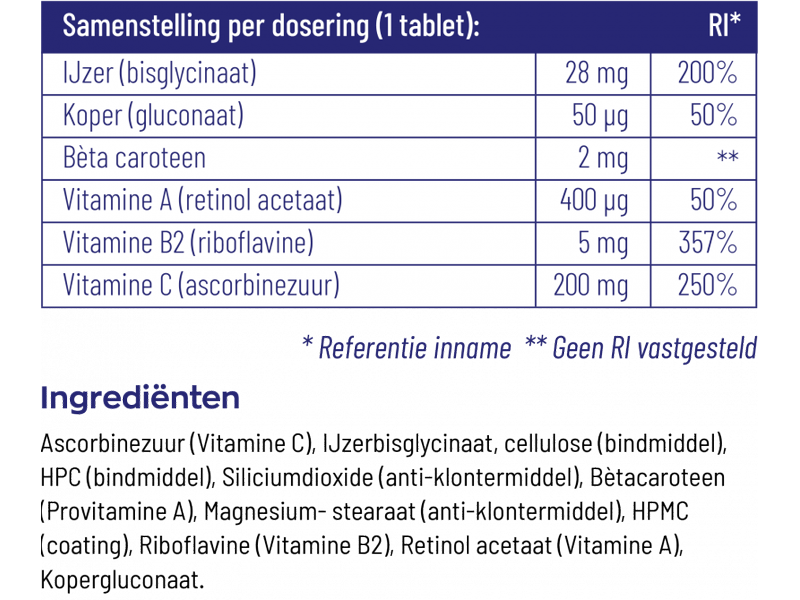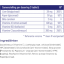 Overige ingrediënten: Ascorbinezuur (Vitamine C), IJzerbisglycinaat, cellulose (bindmiddel), HPC (bindmiddel), Siliciumdioxide (anti-klontermiddel), Bètacaroteen (Provitamine A), Magnesium-stearaat (anti-klontermiddel, HPMC (coating), Riboflavine (Vitamine B2), Silicium dioxide (anti-klontermiddel), Retinol acetaat (Vitamine A), Kopergluconaat.
