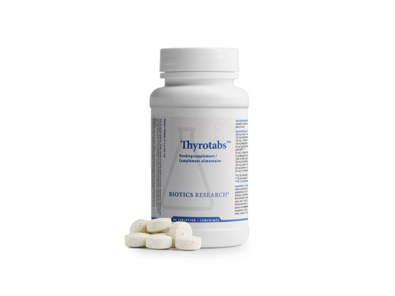 Thyrotabs van Biotics is een complex van hypofyse/hypothalamusconcentraat en cofactoren voor de schildklier. Dit product bevat een aantal essentiële nutriënten zoals jodium, selenium en L-tyrosine. De tabletten zijn op basis van een plantencultuur en er worden geen synthetische hulpstoffen gebruikt.