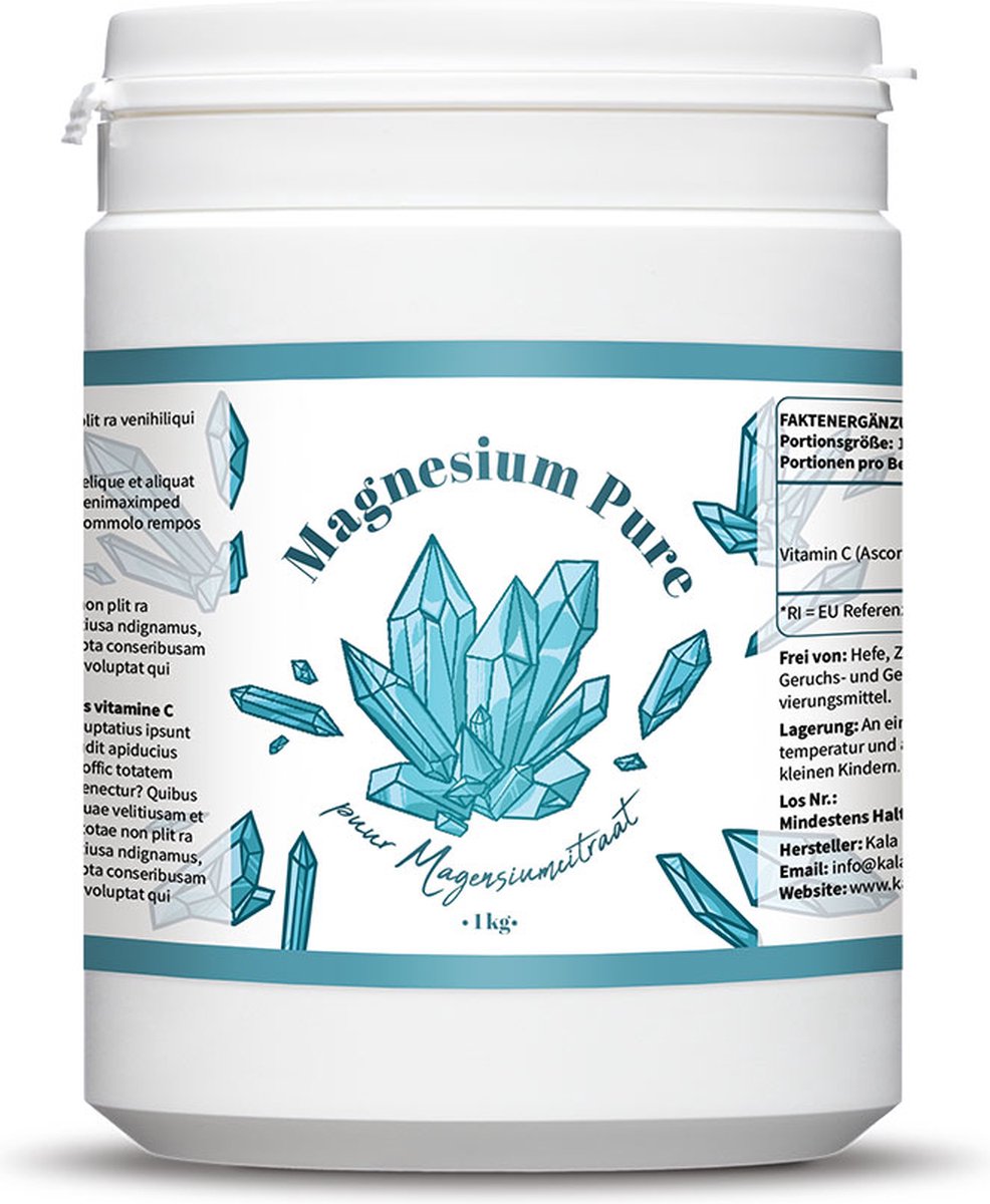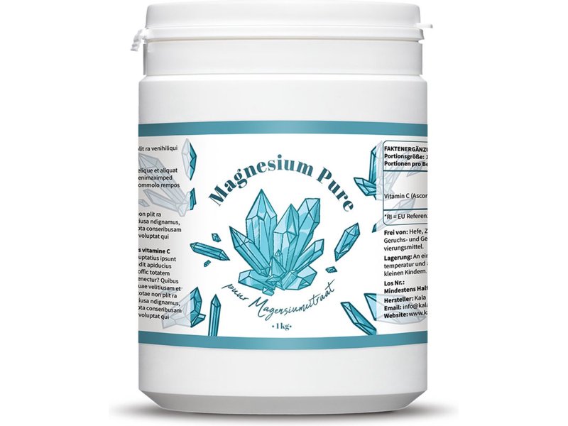Voordeelverpakking Magnesiumcitraat poeder van Kala Health. Deze pot bevat maar liefst 1000 gram poeder en is een hoogwaardig magnesium supplement. Magnesium citraat is een verbinding van magnesiumcarbonaat en citroenzuur. Deze vorm is organisch en wordt goed opgenomen door ons lichaam.