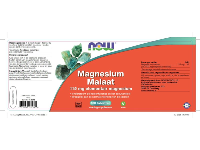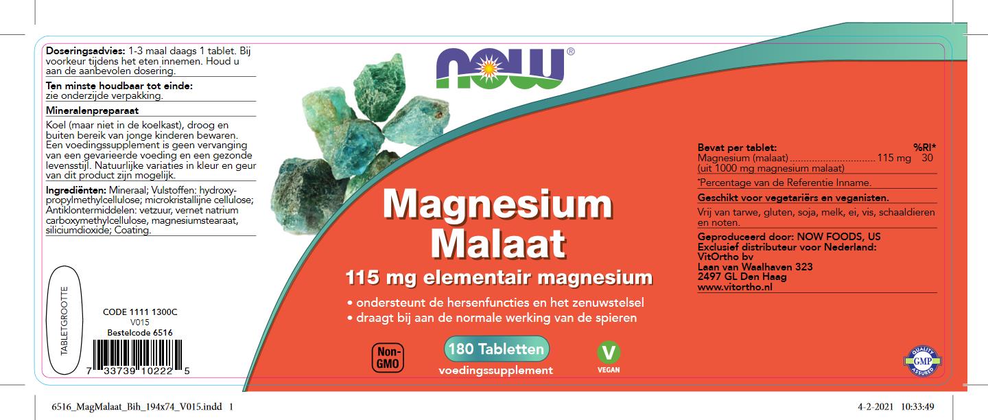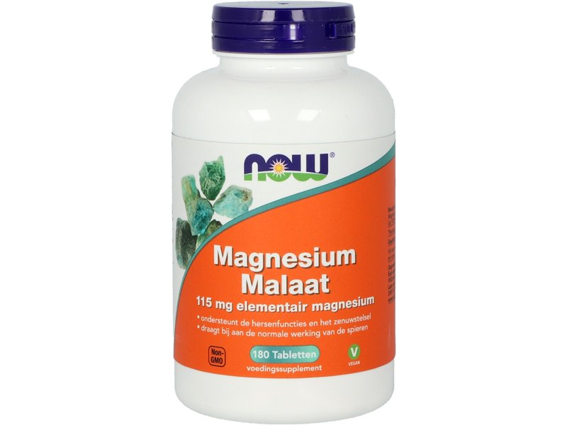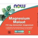 NOW Magnesium Malaat tabletten bevat 115 mg per tablet. Magnesium malaat is een goed opneembare vorm van magnesium. Het is gebonden aan appelzuur dat een rol speelt in en citroencylcus. Deze cyclus is mede-verantwoordelijk voor de energie die vrijkomt in onze cellen.