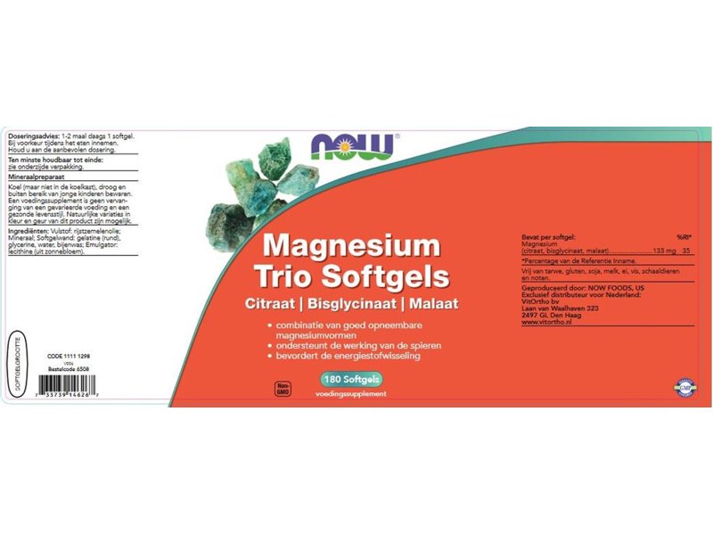 NOW Magnesium Trio Softgels bevat een combinatie van 3 organische magnesiumverbindingen. Dit zijn citraat, bisglycinaat en malaat. Het unieke aan dit voedingssupplement is dat het is opgelost in olie. Dit zorgt mede voor een goede opname en het blijft langer aanwezig in het lichaam.