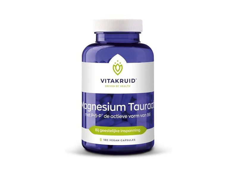 Magnesium is een mineraal dat betrokken is bij veel verschillende functies. Het is goed voor de spieren, hersenfunctie, botten en geeft meer energie bij vermoeidheid. Het mineraal is beschikbaar in verschillende vormen. Vitakruid Magnesium Tauraat met P-5-P bevat de magnesium in tauraatvorm. Magnesium tauraat is een combinatie van het aminozuur L-taurine en magnesium. Deze combinatie is aan te bevelen voor de verbetering van de gemoedstoestand, de leerprestaties, het concentratievermogen, geheugen en zenuwstelsel.