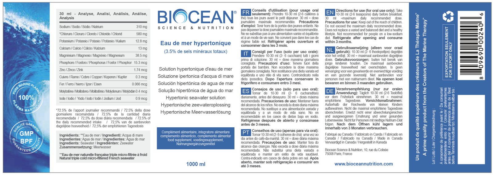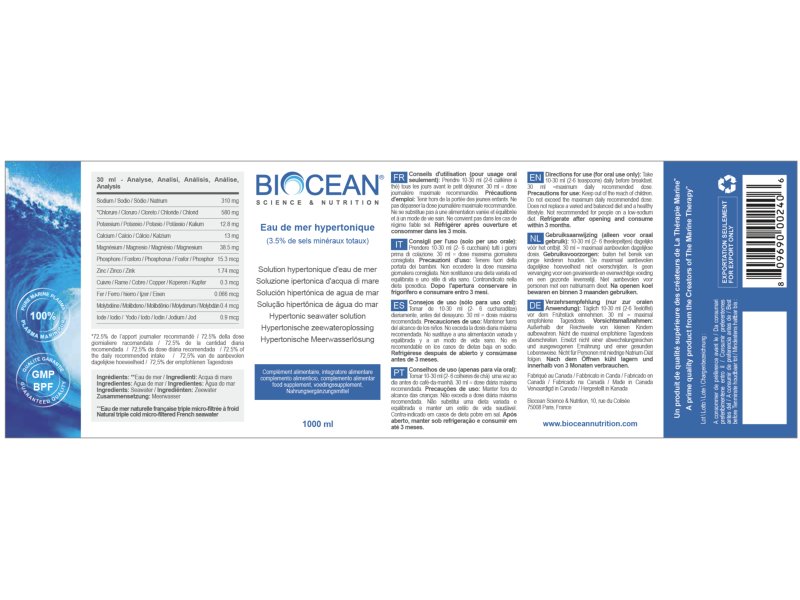 BiOcean® Hypertonic bevat de mineralen chloride, natrium, calcium, magnesium, kalium, zink, fosfor, molybdeen, koper, ijzer en jodium in hun natuurlijke en actieve vorm. BiOcean® Hypertonic bevat dezelfde mineralen en sporenelementen als BiOcean® Isotonic. Alleen is dit product sterker geconcentreerd.