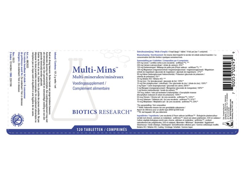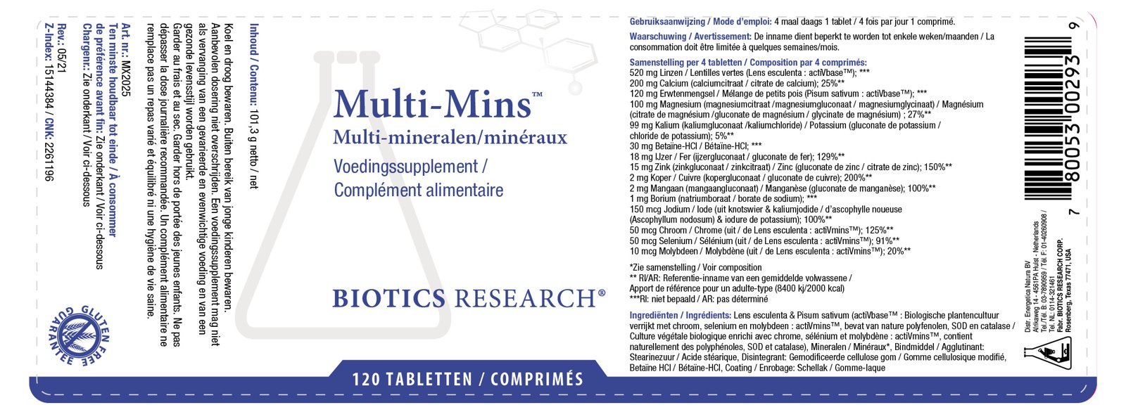 De Multi-Mins tabletten bevatten Lens esculenta en Pisum Sativum (Linzen en Erwtenmengsel, actiVbase®). Dit is een Biologische plantencultuur verrijkt met molybdeen, selenium en chroom. Dit bevat van nature SOD, catalase en polyfenolen.