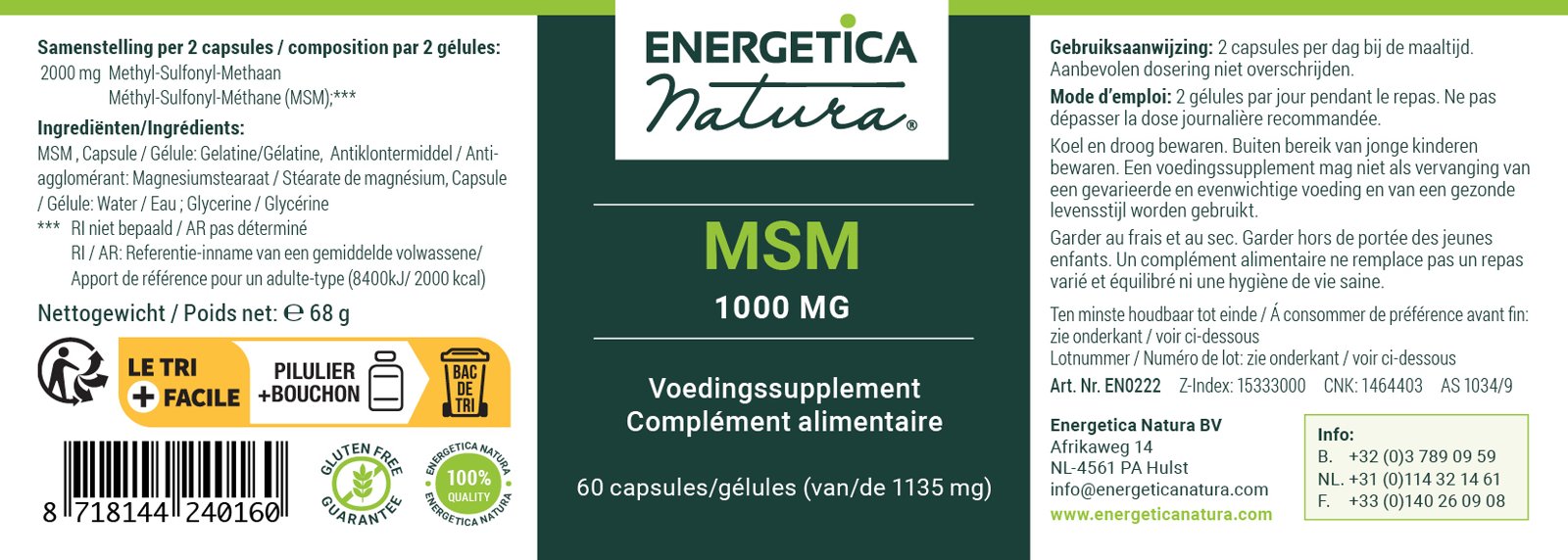De MSM capsules van Energetica Natura bevatten 1000 mg MSM per capsule. MSM (methylsulfonylmethaan) is een natuurlijke vorm van zwavel.