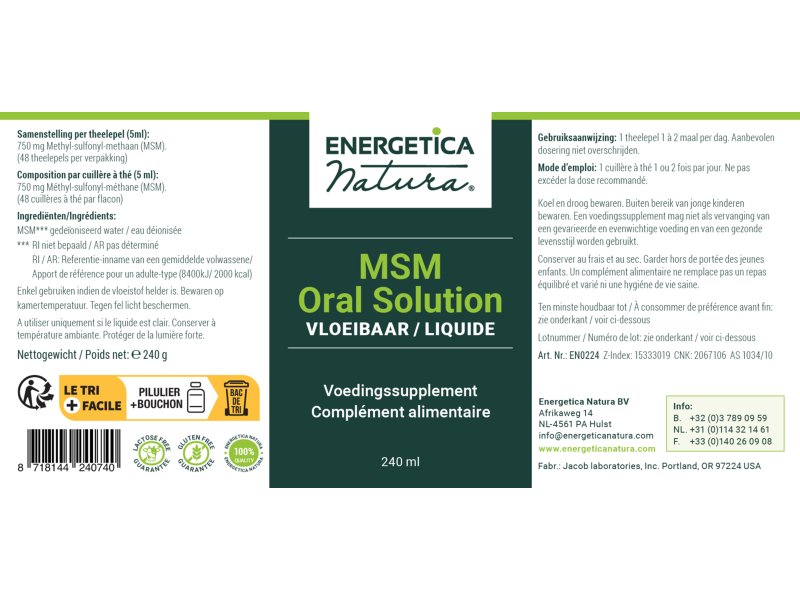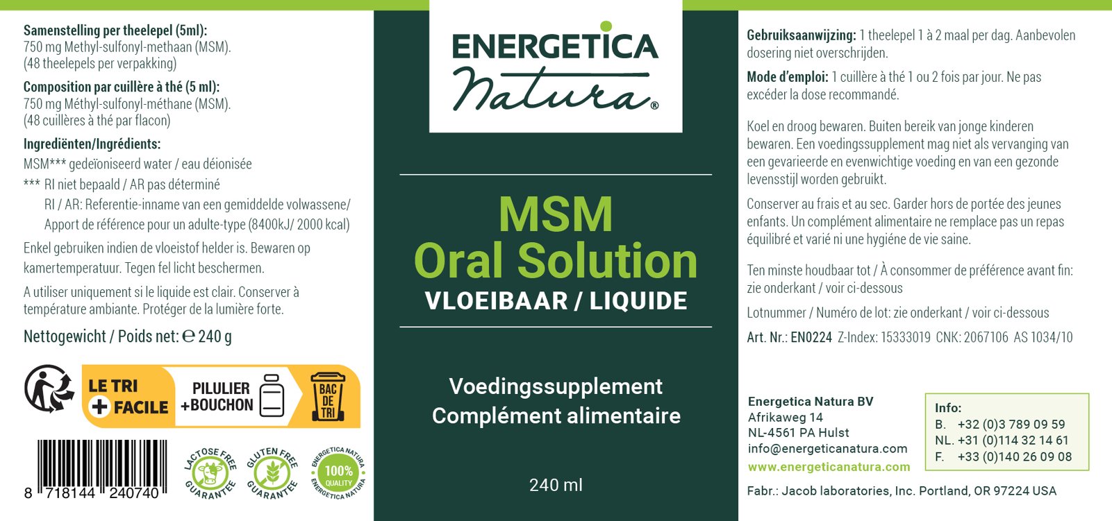 MSM Oral Solution van Energetica Natura is een vloeibaar MSM Supplement. Dit product is zeer geschikt voor diegene die moeite heeft met het slikken van tabletten of capsules. Het vloeibare MSM is gemakkelijk te doseren. De adviesdosering is 1 tot 2 maal per dag theelepel.