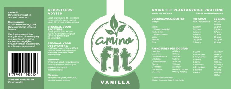 Proteïne of eiwitten bestaan uit ketens van aminozuren. In totaal zijn er 22 verschillende aminozuren. We besparen je even de lastige namen. 13 van deze aminozuren kan je lichaam zelf aanmaken. De andere 9 krijgen we binnen via ons voedsel. Dit worden dan ook wel essentiële aminozuren genoemd. Op de meeste etiketten van proteïne poeders staat welke aminozuren het product bevat. Zie hieronder het etiket van Amino-Fit: