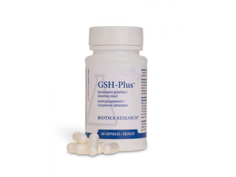 Biotics GSH Plus is een Glutathion supplement. Elke capsule bevat 150 mg L-Glutathion. De 'Plus' in dit product staat voor de extra toevoeging van N-acetyl-L-Cysteïne en Glycine. Gluthathion wordt namelijk opgebouwd uit onder andere cysteïne en glycine. Met deze toevoeing is Biotics GSH Plus een compleet Glutathion supplement.