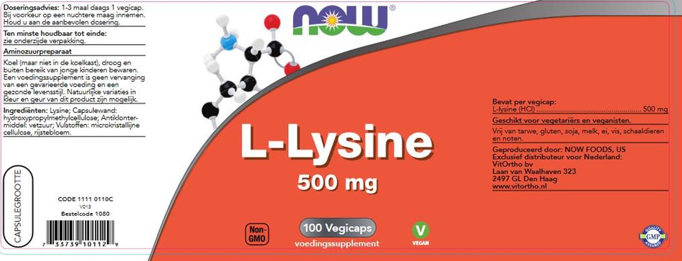 NOW L-Lysine bevat 500 mg per capsule en uitsluitend de natuurlijke L-Vorm.