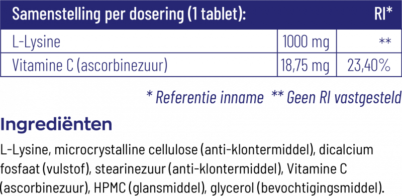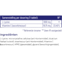 Overige ingrediënten:L-Lysine, microcrystalline cellulose (anti-klontermiddel), dicalcium fosfaat (vulstof), stearinezuur (anti-klontermiddel), Vitamine C (ascorbinezuur), HPMC (glansmiddel), glycerol (bevochtigingsmiddel).