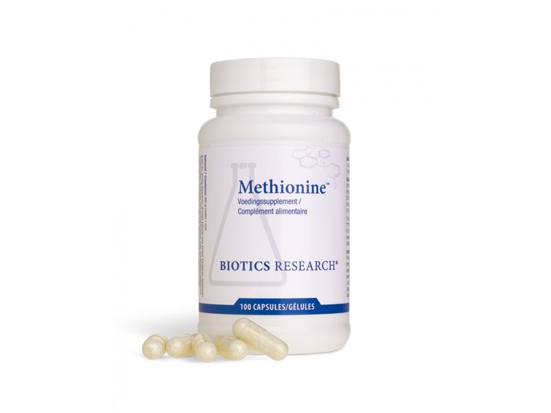Biotics Methionine capsules bevatten 200 mg L-Methionine. Aan de capsules is ook L-Lysine en L-Cysteïne toegevoegd.