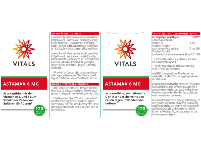 Vitals Astamax is een astaxanthine supplement dat is aangevuld met de antioxidanten vitamine C en vitamine E. De astaxanthine is afkomstig van AstaReal®. AstaReal® is een pionier op het gebied van astaxanthine. De productiemethode is uniek en zorgt voor een pure en natuurlijke astaxanthine. De alg met astaxanthine wordt volledig gebruikt.