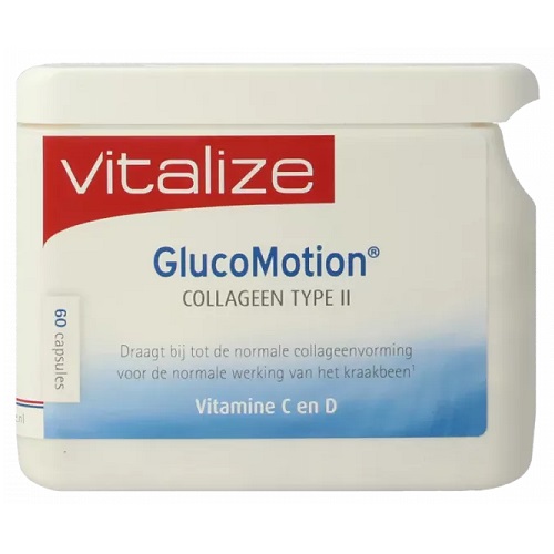 Vitalize Glucomotion bevat collageen type ll, Vitamine C en D. Elke capsule levert 40 mg collageen type 2. Hiervan is 25% (10 mg) ongedenatureerd. De toevoeging van Vitamine C (calciumascorbaat) draagt bij tot de normale collageenvorming van het kraakbeen. De capsules kunnen voor onbeperkte periode gebruikt worden.