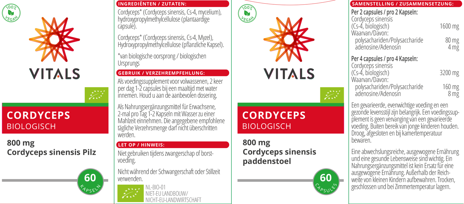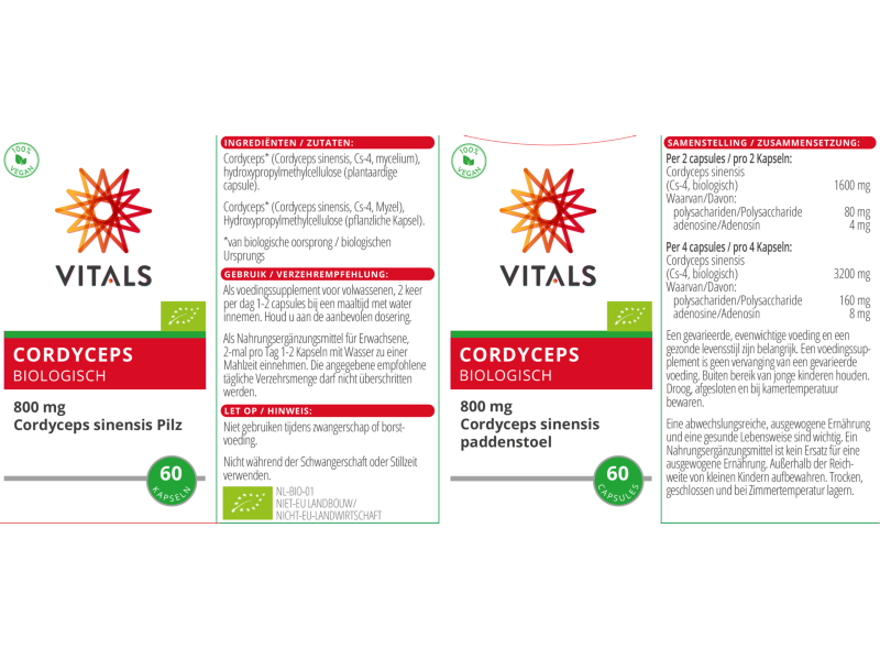 Vitals Cordyceps capsules bevatten 800 mg Cordyceps sinensis per capsule. De belangrijke stoffen polysachariden en adenosine zijn gestandaardiseerd. Polysachariden op minimaal 5% en adenosine op minimaal 0,25%. Door de standaardisatie weet je 100% zeker dat je de belangrijke stoffen daadwerkelijk binnenkrijgt.