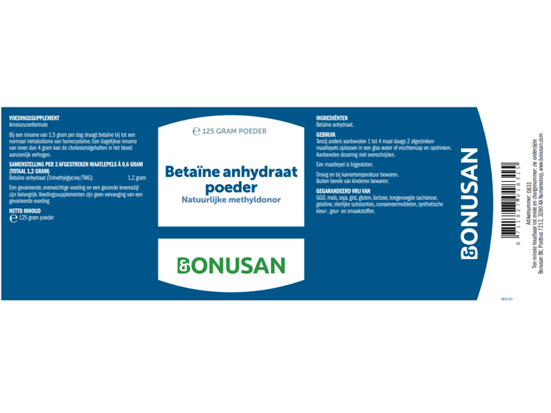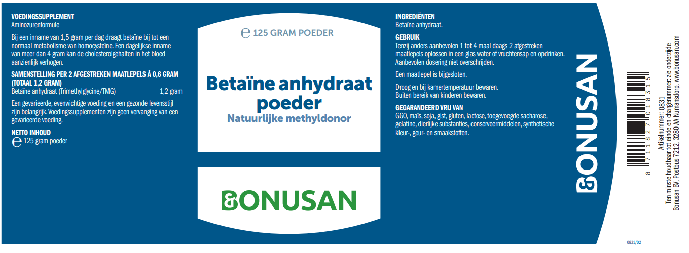 Bij een inname van 1,5 gram per dag draagt betaïne, ook wel trimethylglycine of TMG genoemd, bij tot een normaal metabolisme van homocysteïne.