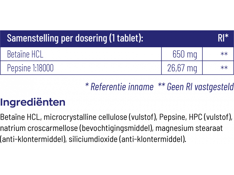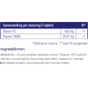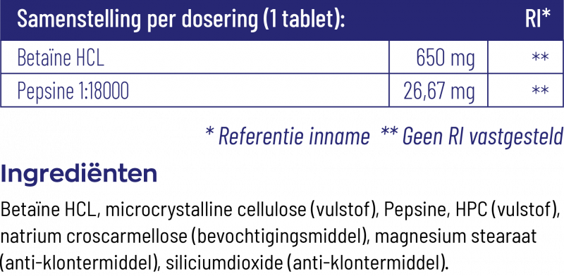 Ingrediënten samengevat: Betaïne HCL, microcrystalline cellulose (bindmiddel), Pepsine, HPC (coating), silicium dioxide (bindmiddel), HPMC (coating), magnesium stearaat (anti-klontermiddel), glycerol (bevochtigingsmiddel).