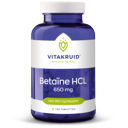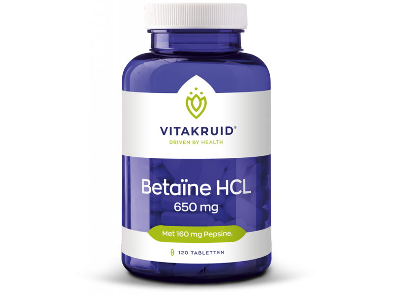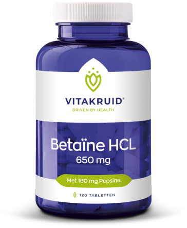 Vitakruid Betaïne HCL bevat een hoge dosering van 650 mg betaïne per tablet. Als extra toevoeging is zijn de tabletten aangevuld met pepsine.