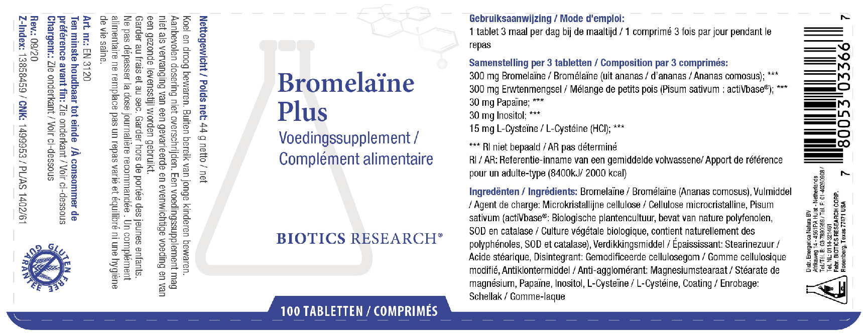 Ingrediënten samengevat: bromelaïne, vulstof: microkristallijne cellulose, pisum sativum (actiVbase®: biologische plantencultuur, bevat van nature polyfenolen, SOD en catylase), bindmiddel: stearinezuur, disintegrant: gemodificeerde cellulosegom, anti-klontermiddel: magnesiumstearaat, papaïne, inositol, l-cysteïne hydrochloride, coating: schellak