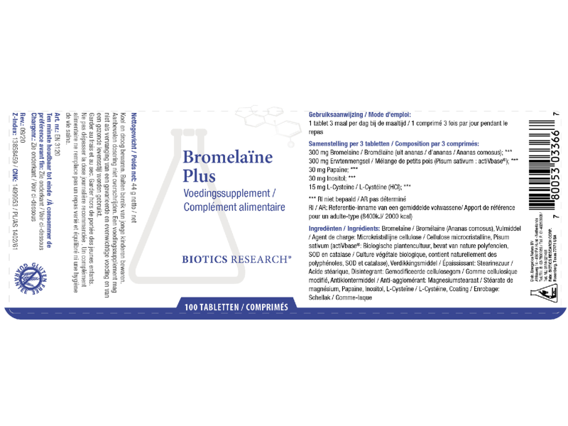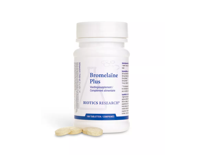 Biotics Bromelaïne Plus is, zoals de naam al doet vermoeden, een bromelaïne supplement. Dit product heeft als extra toevoeging papaïne, inositol en cysteïne. De Bromelaïne uit dit product is afkomstig uit ananas (ananas comosus).