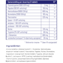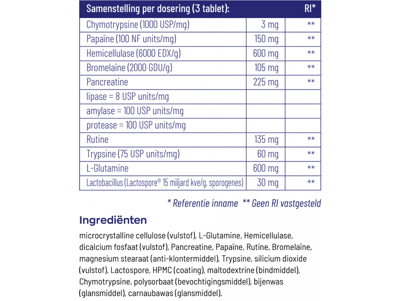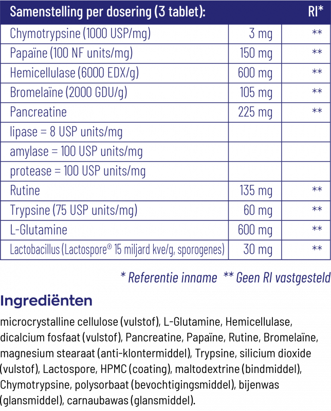 Ingrediënten samengevat: L-Glutamine, hemicellulase, dicalcium fosfaat, HPC (bindmiddel), pancreatine, papaïne, rutine, bromelaïne, magnesium stearaat (anti-klontermiddel), trypsine, lactospore, HPMC (coating), chymotrypsine.