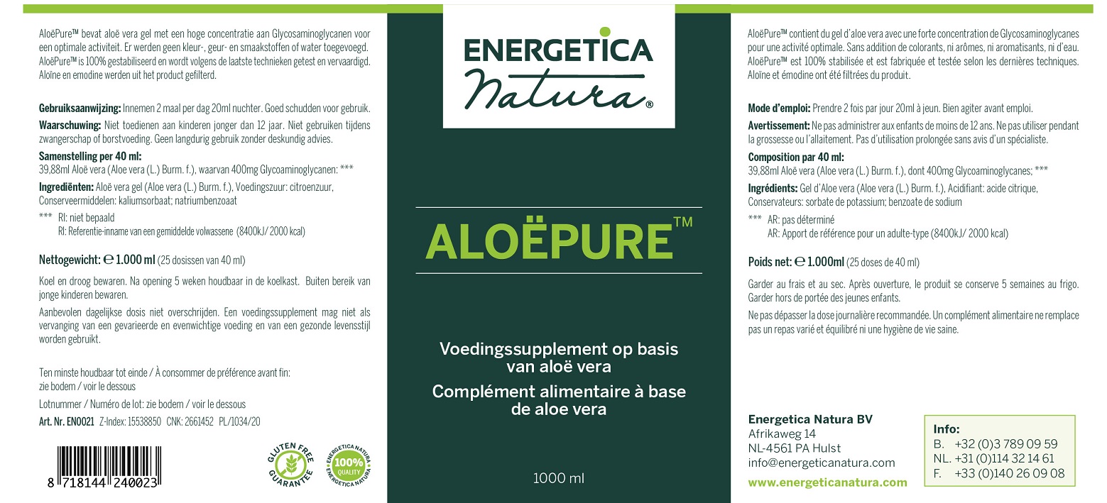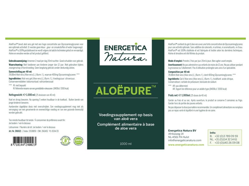 AloëPure van Energetica is een vloeibare aloë vera die geschikt is om te drinken. Het bevat een hoge concentratie aan Glycosaminoglycanen dat zorgt voor een optimale activiteit. De Aloïne en emodine zijn uit het product gefilterd.