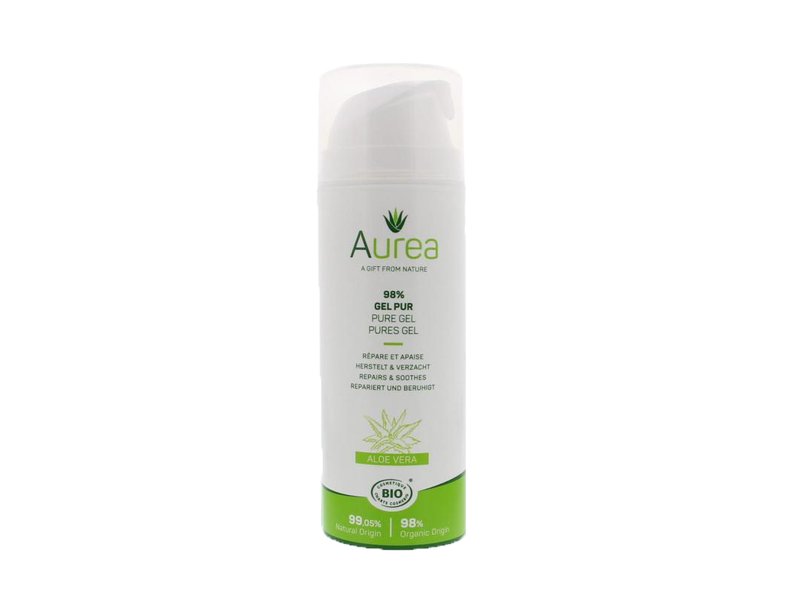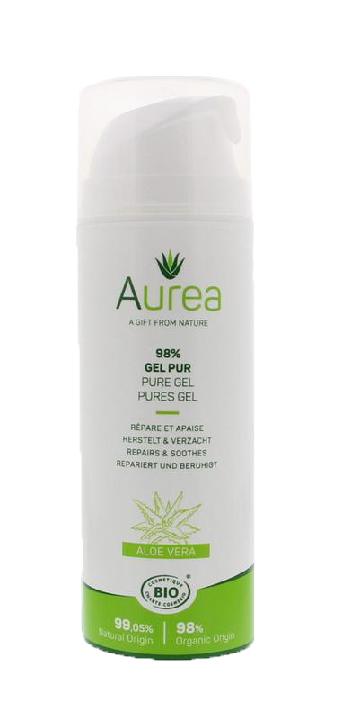 Aloë Vera huidgel van Aurea bevat ongeraffineerde en een zuivere gelei van Aloë Vera. Een pure (98%) gel van Aloë Vera dat versterkt is door natuurlijke geleermiddel dat rijk is aan polysacchariden. 98% van de totale ingrediënten hebben een natuurlijke oorsprong en 96,95% van de ingrediënten zijn van biologische landbouw.