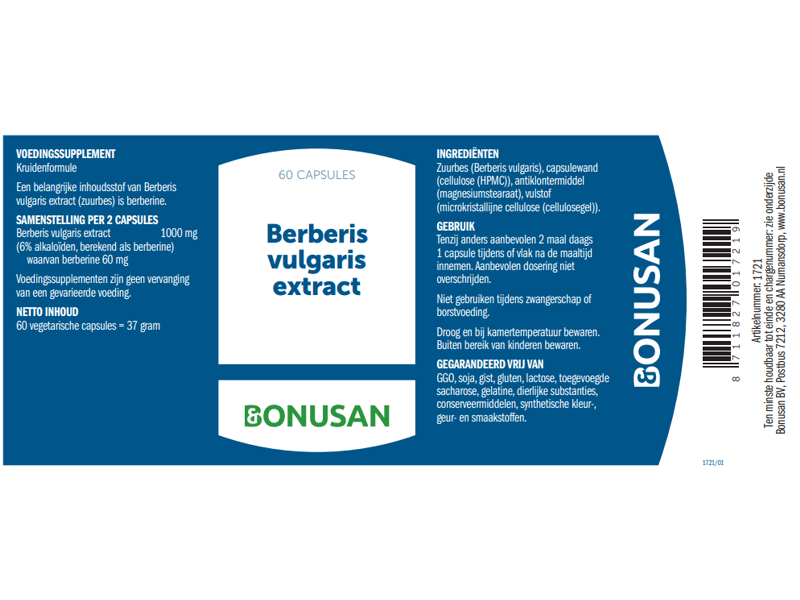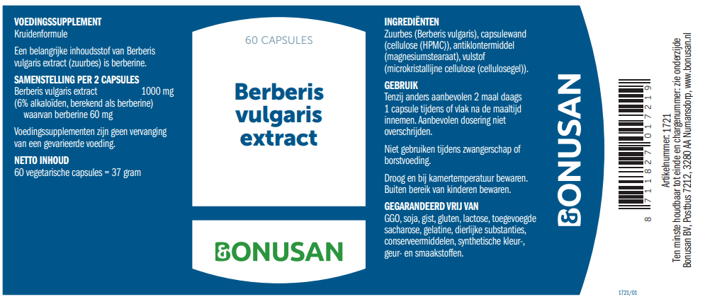 Berberis vulgaris extract van Bonusan bevat 500 mg Berberis vulgaris extract. Berberis vulgaris bevat onder andere berberine, berbamine, canadine en hydrastine. Het is gestandaardiseerd op 6% alkaloïden, berekend als berberine. De dagdosering (2 capsules) lever 60 mg berberine.