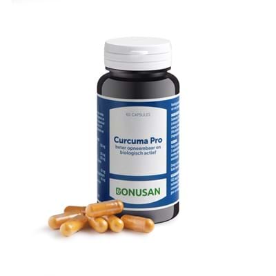 Curcuma Pro van Bonusan is geproduceerd met CurcuWIN™. Deze grondstof heeft een duurzame biologische beschikbaarheid en een hoge wateroplosbaarheid. Mede daardoor wordt het goed geabsorbeerd. CurcuWIN™ heeft eenzelfde curcuminoïdenprofiel als de van nature curcumawortelstok (Curcumine circa 75%, demothoxycurcumine circa 15% en bismethoxycurcumine circa 5%).
