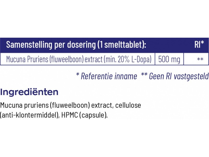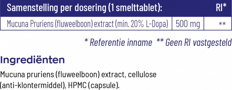 Overige ingrediënten: Mucuna pruriens (fluweelboon) extract, cellulose (anti-klontermiddel), HPMC (capsule).