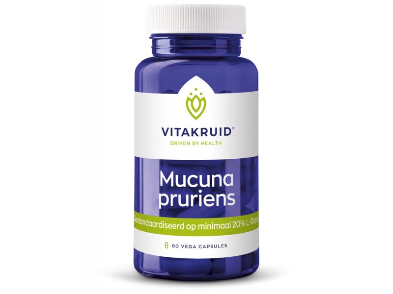 Vitakruid Mucuna Pruriens is een hoogwaardig fluweelboonsupplement met minimaal 20% L-Dopa. Dit is de voorloperstof van dopamine.