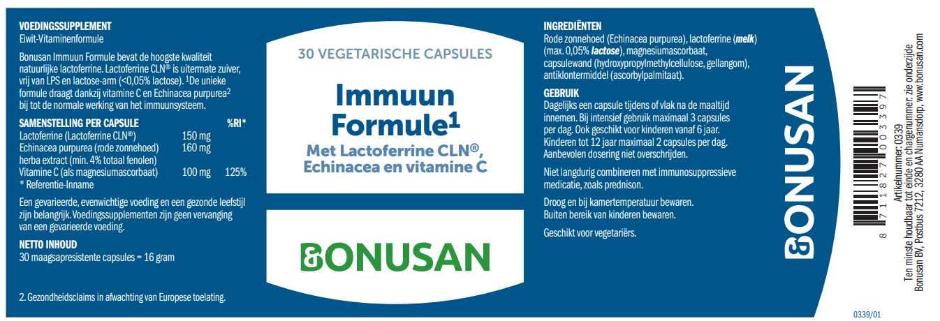 Bonusan Lactoferinne Immuun Formule is vrij van onnodige hulpstoffen. Het bevat alleen de natuurlijke vorm van vitamine C (ascorbylpalmitaat) als hulpstof. Zo krijgt je lichaam alleen het bruikbare ter ondersteuning van het immuunsysteem. Iets wat je van een Immuun formule verwacht.