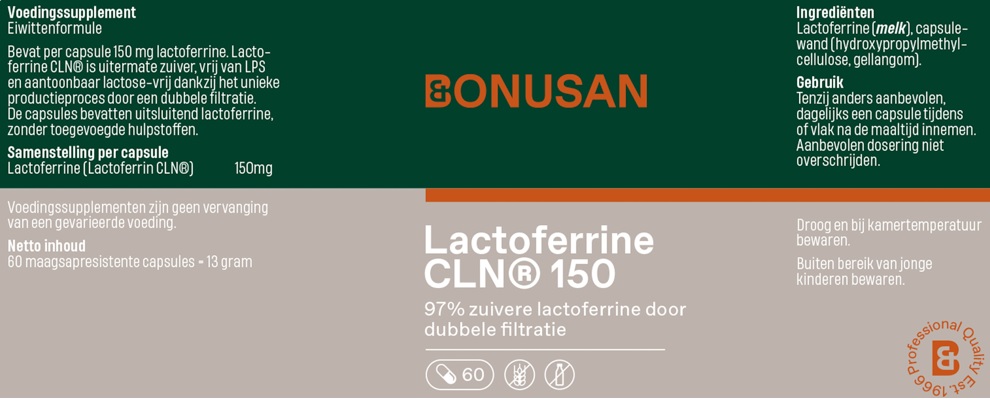 Bonusan Lactoferrine bevat gezuiverde lactoferrine die vrij is van LPS. Elke capsule bevat 150 mg lactoferrine met een zuiverheid van 97%. Dit is de hoogste zuiverheid die verkrijgbaar is op de Nederlandse markt.