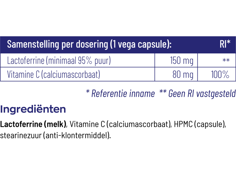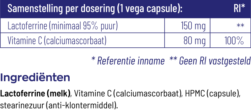 Ingrediënten samengevat: Lactoferrine (melk), Vitamine C (calciumascorbaat), HPMC (capsule), stearinezuur (anti-klontermiddel).