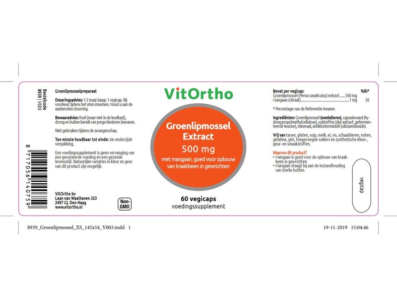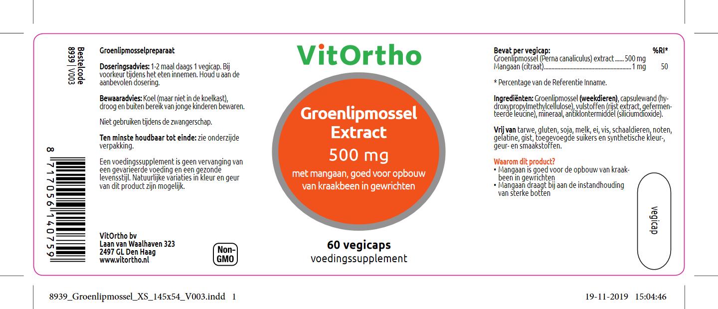 VitOrtho Groenlipmossel Extract bevat naast groenlipmossel ook Mangaan. Mangaan is goed voor de opbouw van kraakbeen in de gewrichten en voor het behoud van sterke botten. Het extract is gevriesdroogd en bevat 3,9% glycosaminoglycanen (GAG).