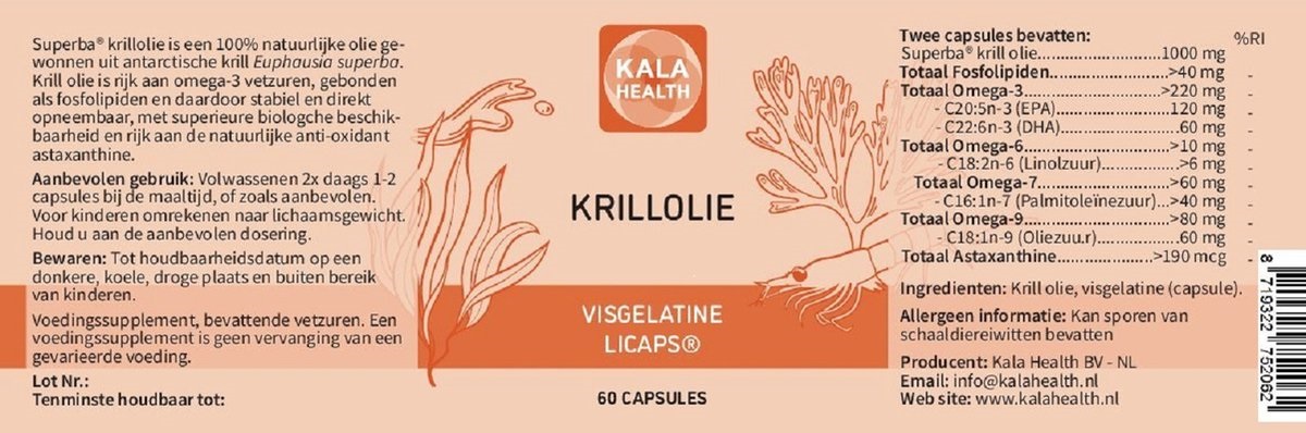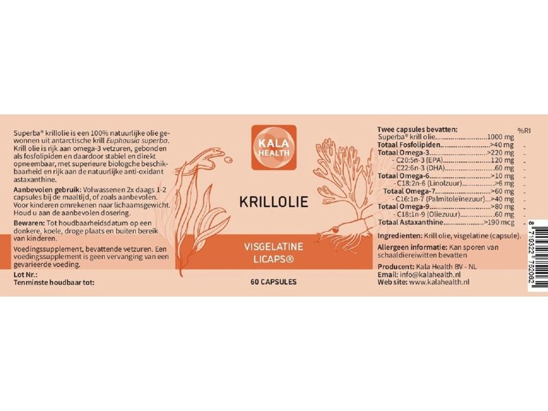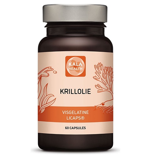 De krillolie capsules van Kala Health bevatten 500 mg Superba® krillolie per capsule. Deze Superba® krillolie bevat 60 mg EPA, 30 mg DHA maar ook andere onverzadigde vetzuren zoals Omega-6, Omega-7 (palmitoleïnezuur), Omega-9 (oliezuur) en is van nature rijk aan de antioxidant astaxanthine.