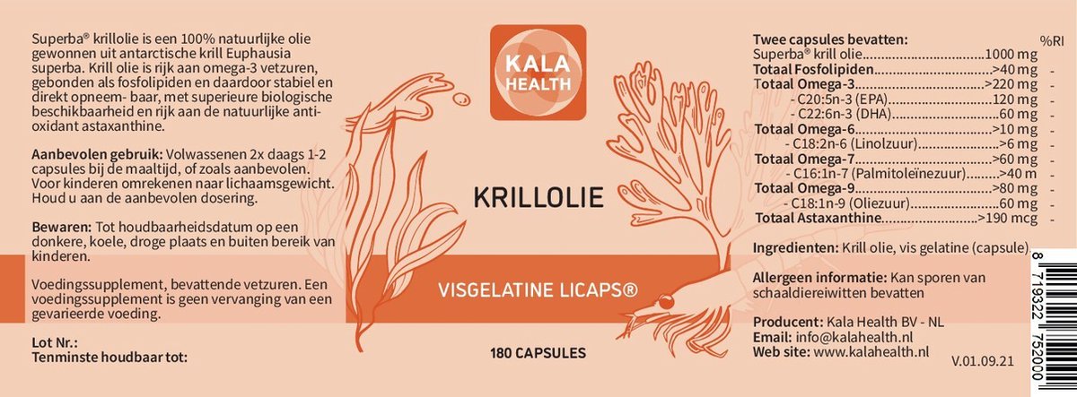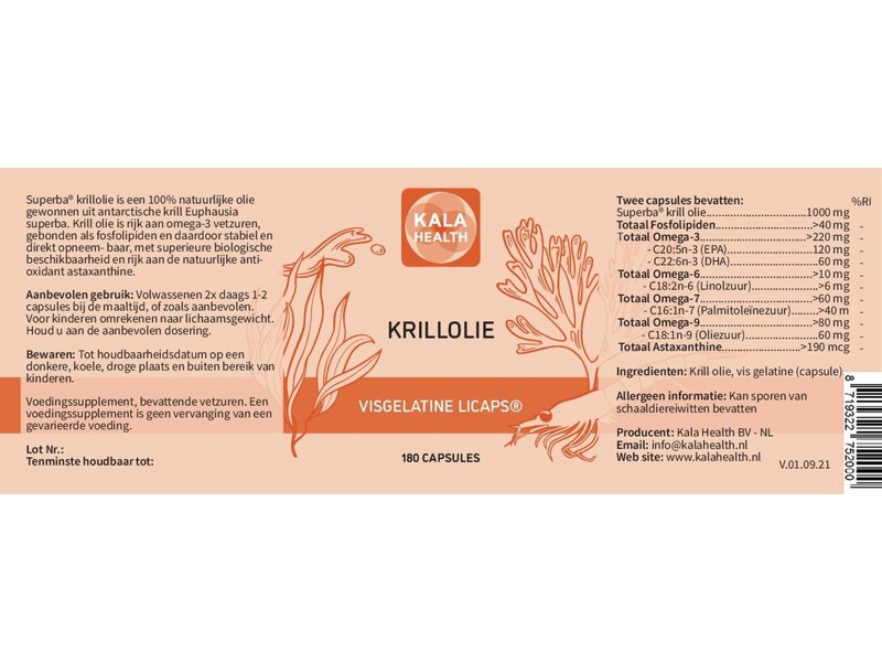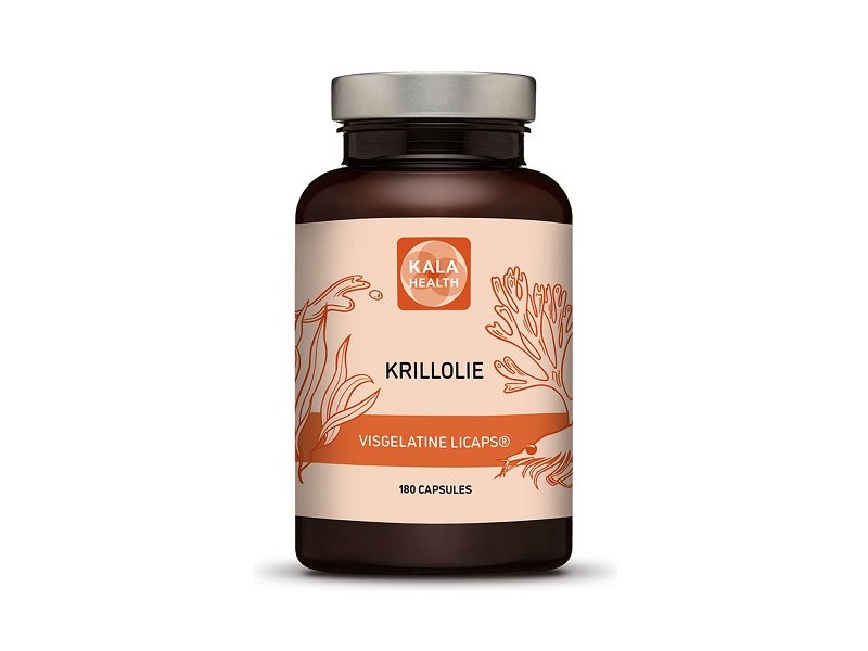 Kala Health Krillolie capsules bevatten 500 mg Superba® krillolie per capsule. Superba® krillolie levert niet alleen Omega 3 vetzuren (EPA 60 mg en DHA 30 mg) maar ook Omega-6, Omega -7 en Omega-9. Krillolie is van nature rijke aan astaxanthine. Deze antioxidant beschermt de lichaamscellen tegen invloeden van buitenaf zoals UV-straling en luchtvervuiling. Astaxanthine zorgt voor de rood-roze kleur van krillolie capsules.