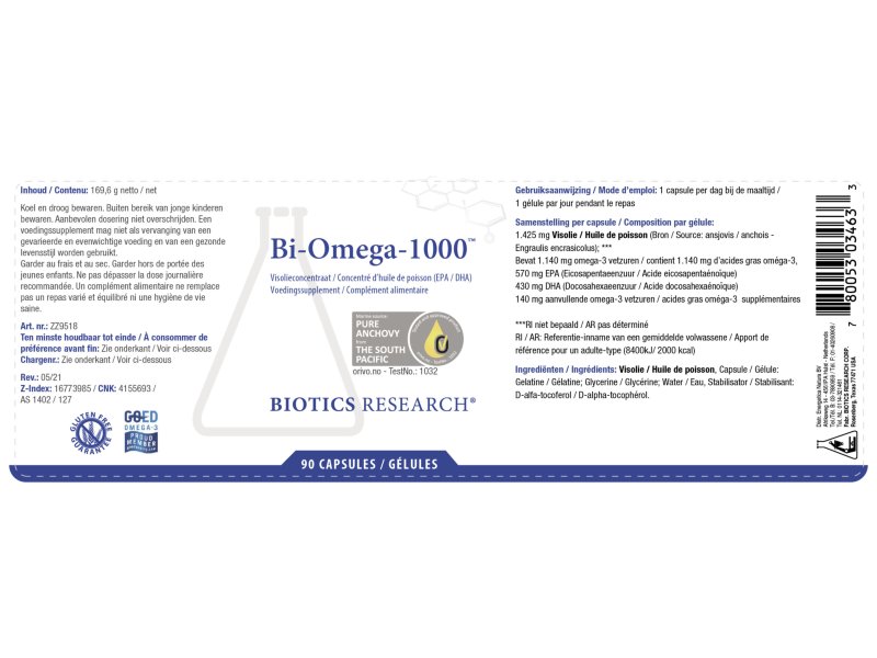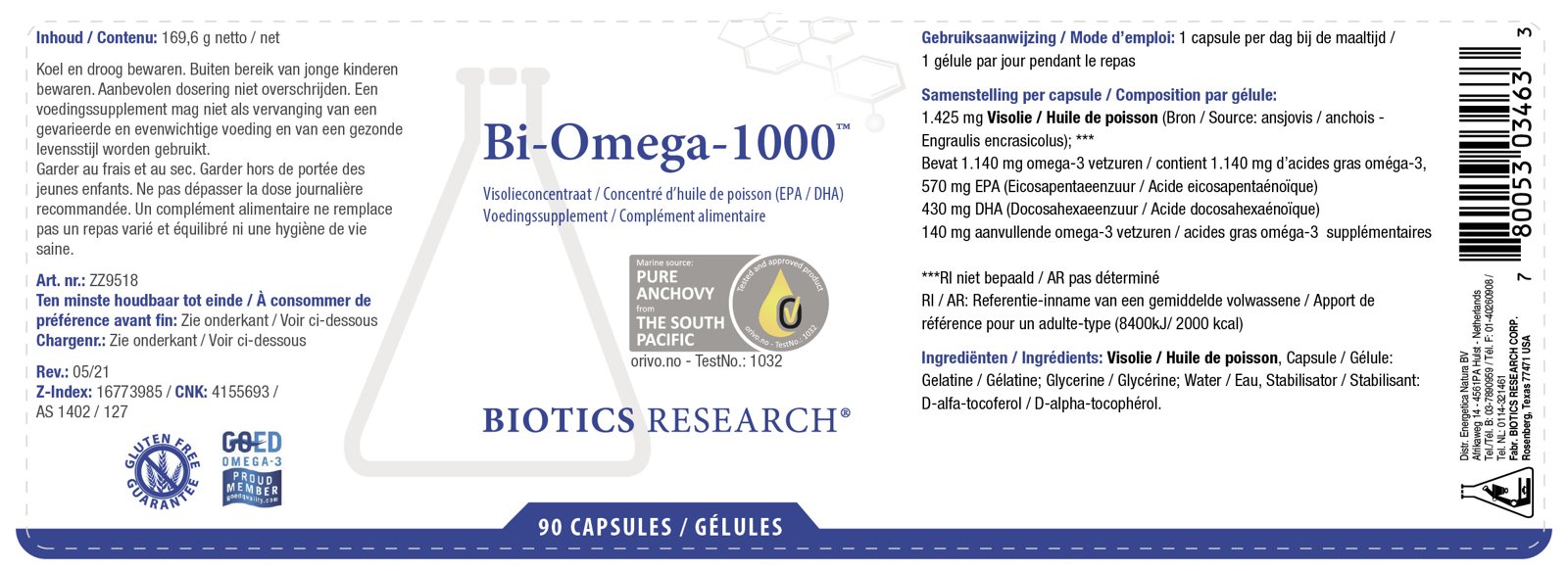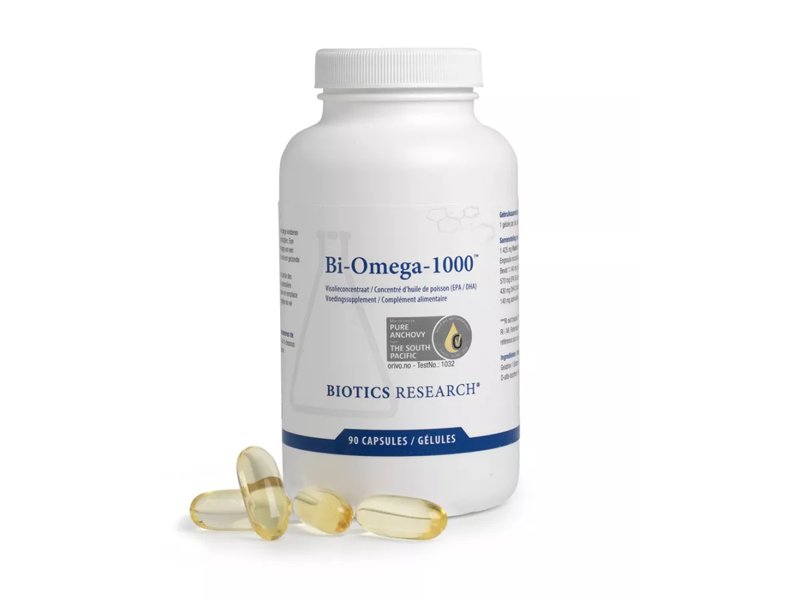 Bi-Omega 1000 van Biotics is een natuurlijke en hooggezuiverde visolie als triglyceriden. De Bi-Omega producten (Bi-Omega 500, Bi-Omega DHA en Bi-Omega 1000) zijn afkomstig van visoliën volgens de GOED-normering (Global Organization for EPA en DHA).