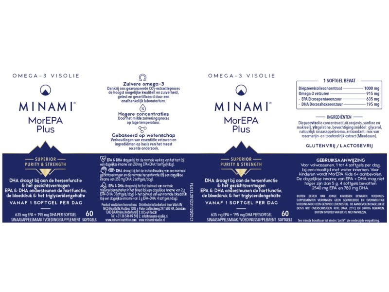 MorEPA Plus is een visolie supplement dat zich kenmerkt door een hoge dosering omega-3 vetzuren. Elke softgel levert 830 mg EPA/DHA. De softgels hebben een sinaasappelsmaak. MorEPA Plus heeft een hoog omega 3 vetzuur percentage van maar liefst 92%. Hierdoor bevat het weinig (minder gewenste) verzadigde vetten.