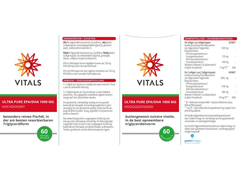 Vitals Ultra Pure EPA/DHA is het hoogst gedoseerde visoliesupplement uit de Ultra Pure visolie lijn van Vitals. Elke softgel levert 1428 mg visolieconcentraat (triglyceriden) wat goed is voor 570 mg EPA (eicosapentaeenzuur) en 430 mg DHA (doxosahexaeenzuur). Dit product is geschikt voor volwassen die hun omega 3 vetzurenbehoefte maximaal willen ondersteunen.