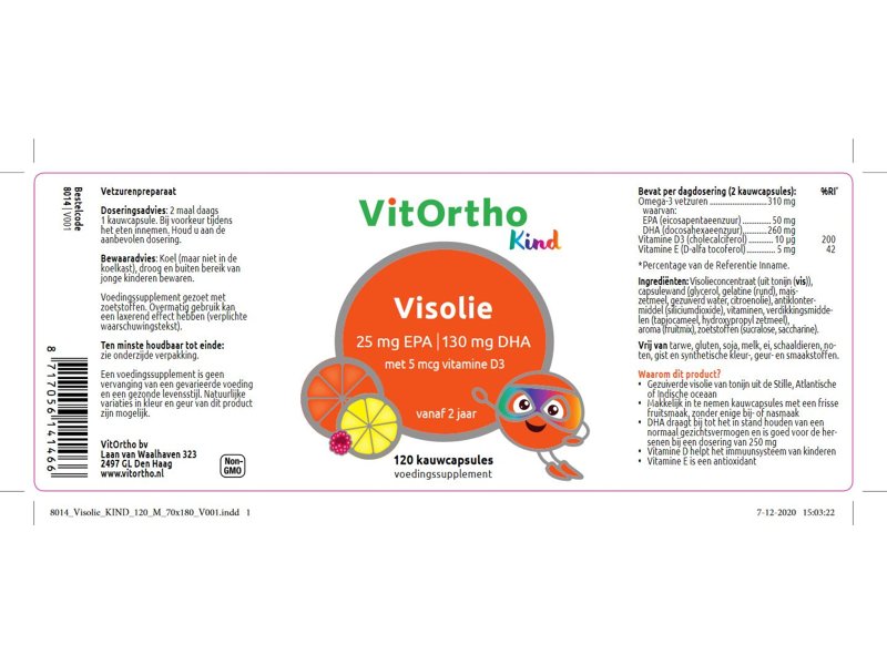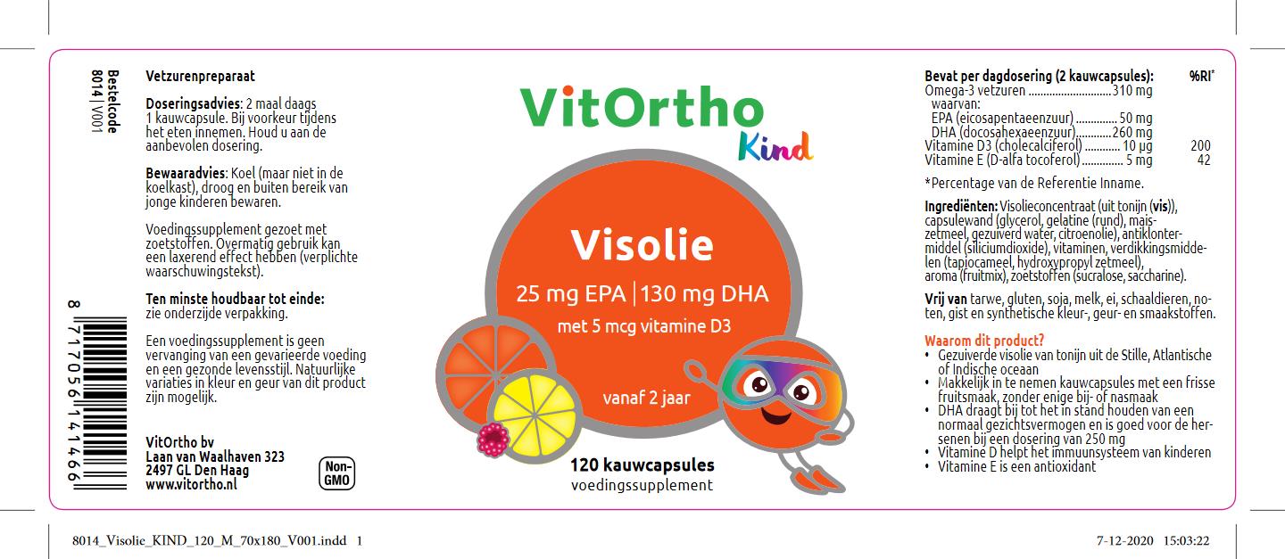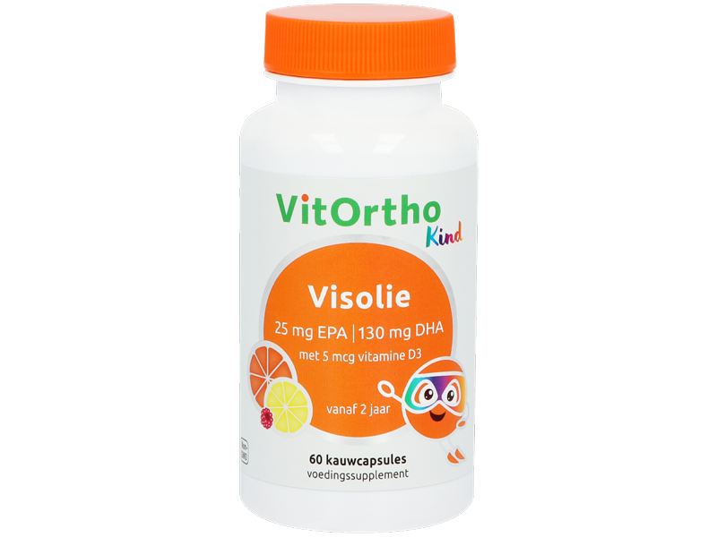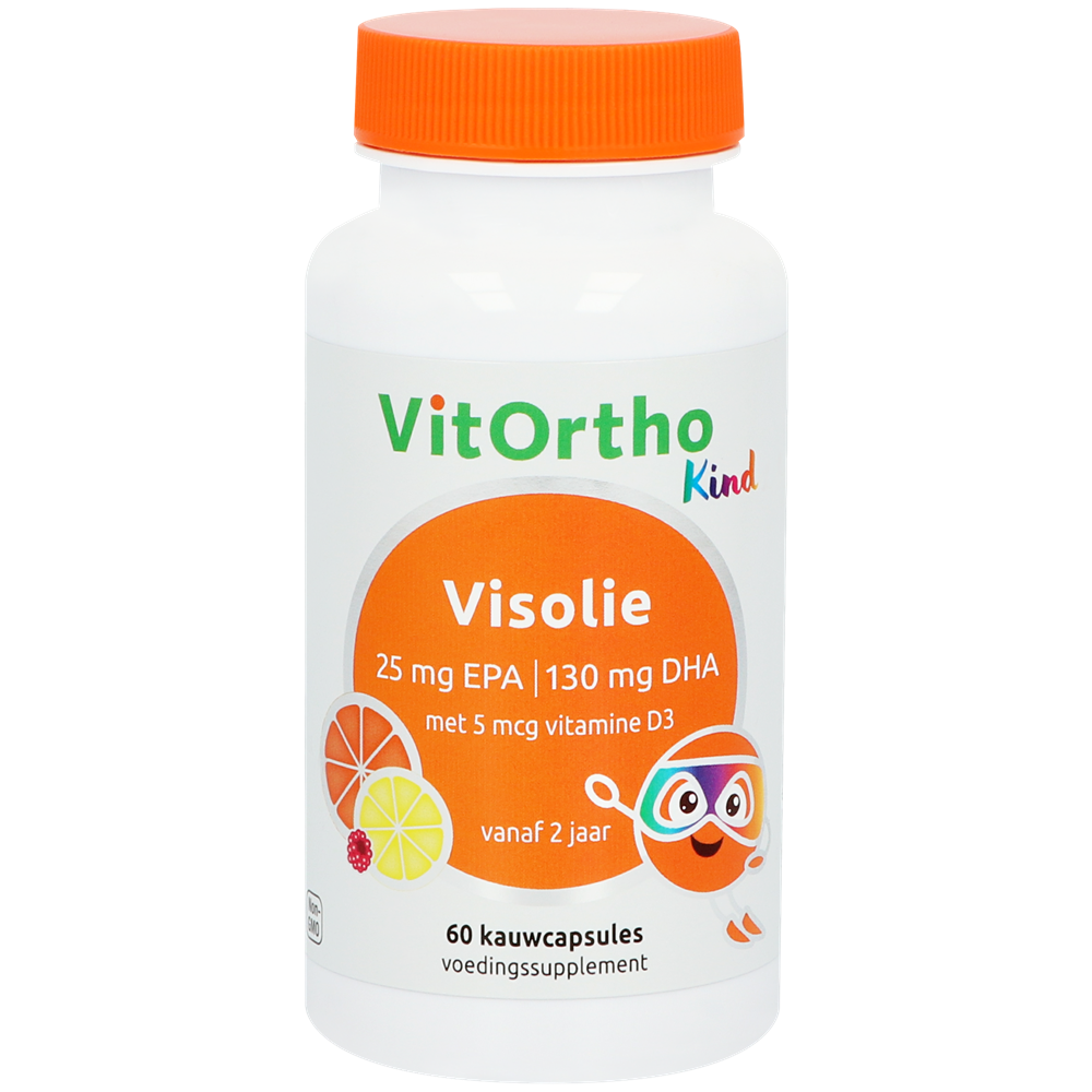 Vitortho Visolie Kind is een visolie supplement geschikt voor kinderen vanaf 2 jaar. De gezuiverde visolie is afkomstig van tonijn uit de Stille, Indische of Atlantische oceaan. De kauwcapsules zijn makkelijk in te nemen en hebben een frisse fruitsmaak. Naast de Omega 3 vetzuren bevat dit product ook vitamine D en vitamine E.