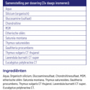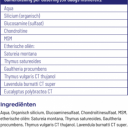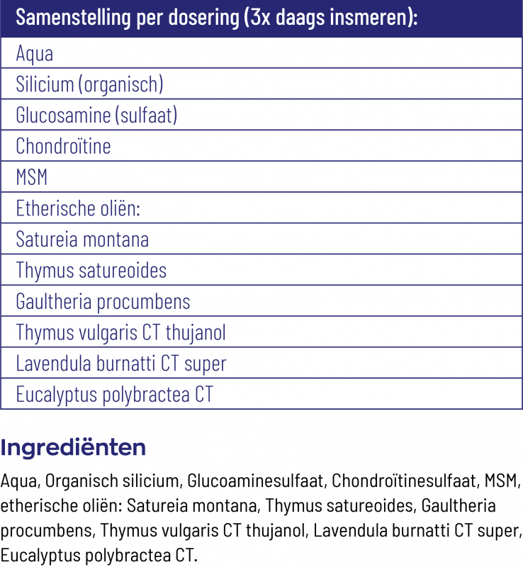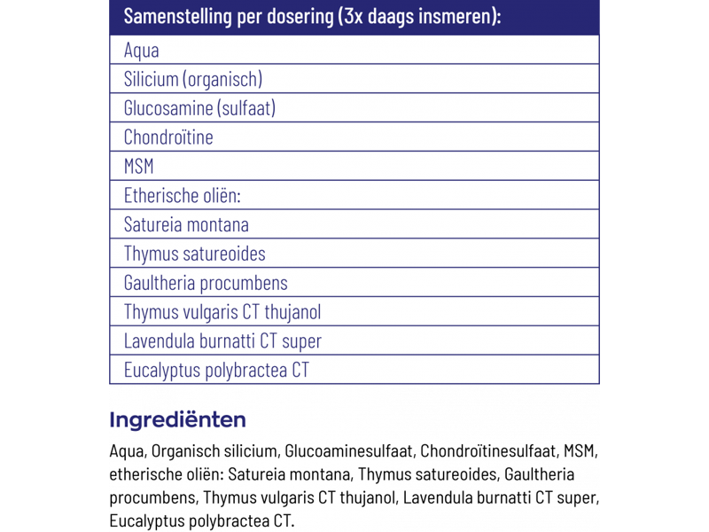 Ingrediënten samengevat: aqua, organisch silicium, glucoaminesulfaat, chondroïtinesulfaat, MSM, etherische oliën: satureia montana, thymus satureoides, gaultheria procumbens, thymus vulgaris CT thujanol, lavendula burnatti CT super, eucalyptus polybractea CT.