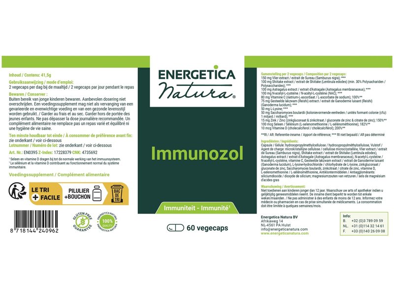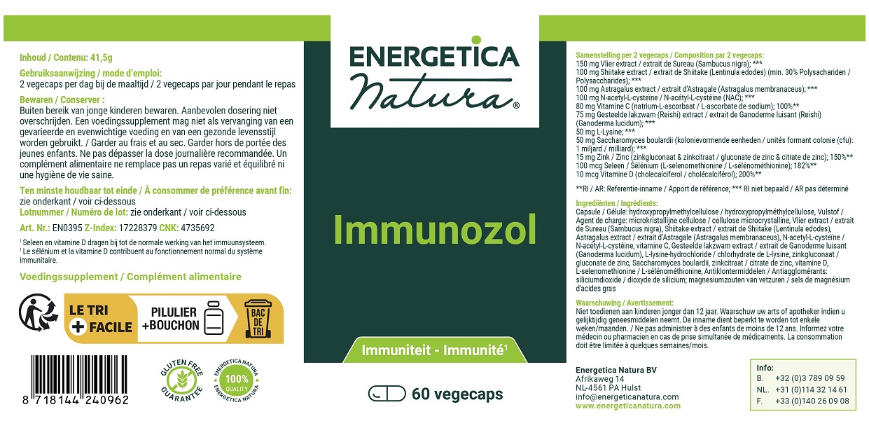 Immunozol van Energetica Natura is uniek immuunondersteunend complex. Het bevat immuunmodulerende paddenstoelen (shiitake en reishi) en fytonutriënten (Astragalus en vlierextract). Deze ingrediënten worden ondersteund met zink, vitamine C, vitamine D, Lysine, NAC en selenium.