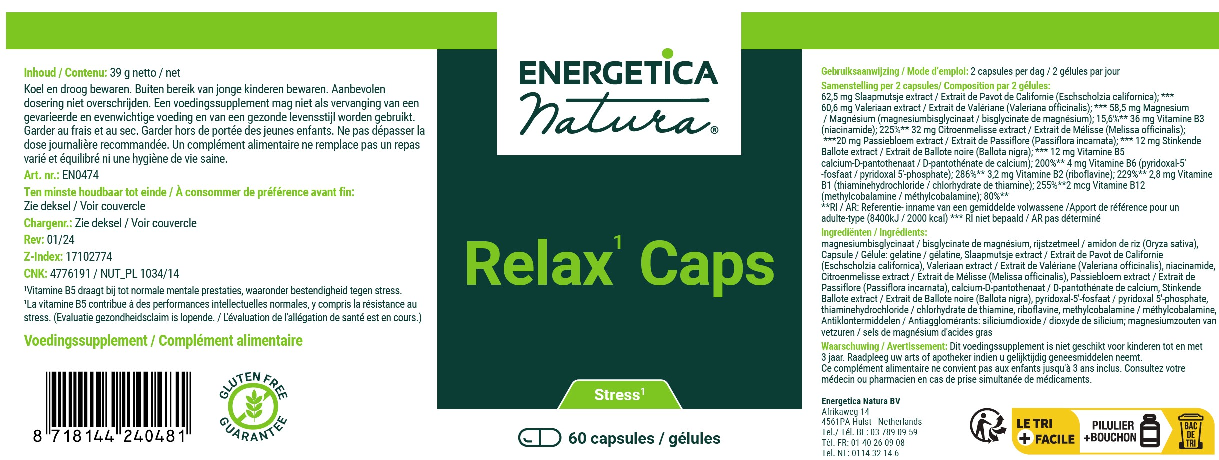 Relax caps van Energetica Natura is een bijzonder formule die magnesiumbisglycinaat en B-vitamines combineert met de rustgevende kruiden valeriaan, slaapmutsje, passiebloem en citroenmelisse. Relax Caps is de nieuwe naam van Relaxol. De ingrediënten en samenstelling zijn ongewijzigd.