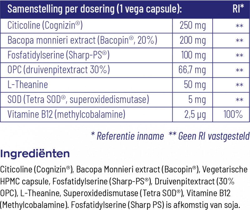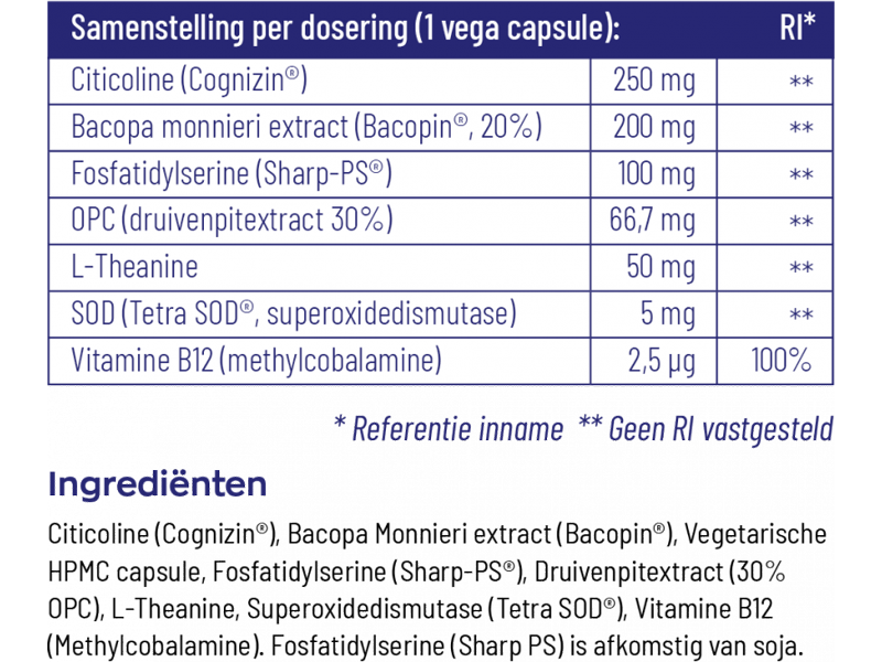 Overige ingrediënten: Citicoline (Cognizin®), Bacopa Monnieri extract (Bacopin®), Vegetarische HPMC capsule, Fosfatidylserine (Sharp-PS®), Druivenpitextract (30% OPC), L-Theanine, Superoxidedismutase (Tetra SOD®), Vitamine B12 (Methylcobalamine). Fosfatidylserine (Sharp PS) is afkomstig van soja.